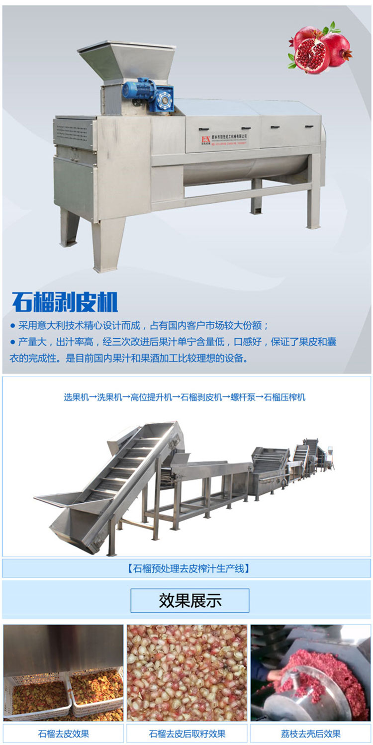 该机采用意大利技术并结合中国石榴品种精心设计而成。目前该机型已发展为第三代。其主要特点是:产量大,出汁率高,并且经过三次改进后果汁单宁含量很低,口感好,保证了果皮和囊衣的完成性。目前国内市场占有率已达到90%以上,是目前国内果汁和果酒加工比较理想的设备。